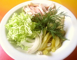 лук красный, пекинская капуста, грудка копченая, огурцы маринованные, майонез
